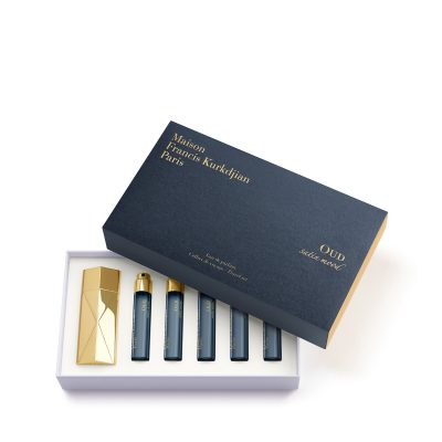 A free interpretation of oud wood, a rare and precious material, this OUD satin mood eau de parfum reflects the creator’s desire to bring a shimmering facet to life. Five refills (11 ml) and a sophisticated gold version of the precious Globe Trotter spray bottle allow you to elegantly take this fragrance with you. The Oud satin mood set makes a perfect gift, whether giving or receiving.